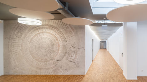 Der grosszügige Eingangsbereich wurde mit einzelnen runden schallabsorbierenden Elementen bestückt, so konnte die Hausinstallation (Lüftung|Elektro) etwas kaschiert werden und doch kann weiterhin von der natürlichen Belichtung profitiert werden.